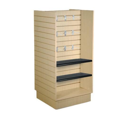 This slatwall fixture features four walls of display space along which you can arrange any selection of accessories. Although it takes up minimal floor space, this slatwall display actually provides you with 26 square feet of display space! The slatwall board has grooves in its surface to hold a variety of accessories, like baskets, hooks and shelves. These accessories attach within seconds by hooking into the panel grooves in the mounting surface.