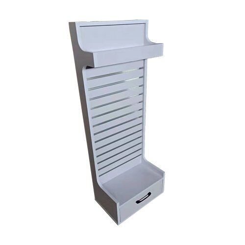 This white slatwall fixture features one walls of display space along which you can arrange any selection of accessories. Although it takes up minimal floor space, this slatwall display actually provides you with 1.29 square feet of display space! The slatwall board has grooves in its surface to hold a variety of accessories, like baskets, hooks and shelves. These accessories attach within seconds by hooking into the panel grooves in the mounting surface.